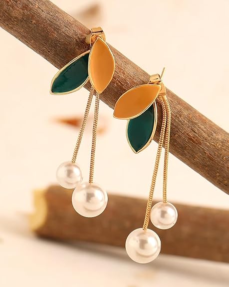 Gold Plated Pearls Beaded Enamelled Leaf Shaped Drop Earrings